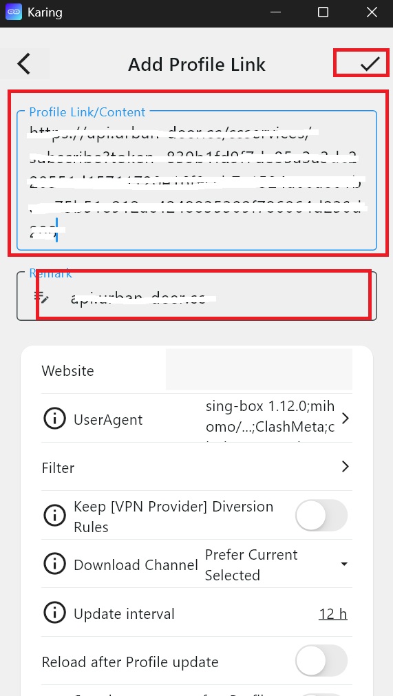 B. After the image below is displayed, the subscription URL will be automatically pasted in. After verifying it, click the checkmark in the upper right corner of the APP page.