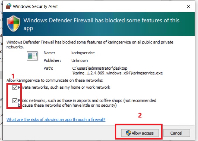 F. In the Windows Firewall settings that pop up next, please follow the steps circled in red in the image below to configure the settings.