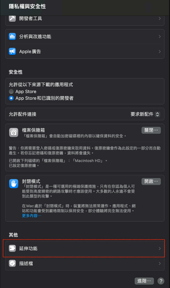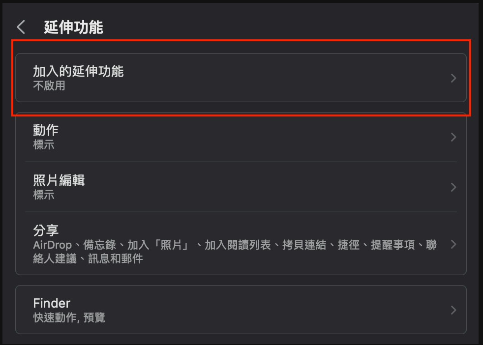 接著 向下捲動,找到 延伸功能 (Extensions),並點選 加入的延伸功能 (Added Extensions)。