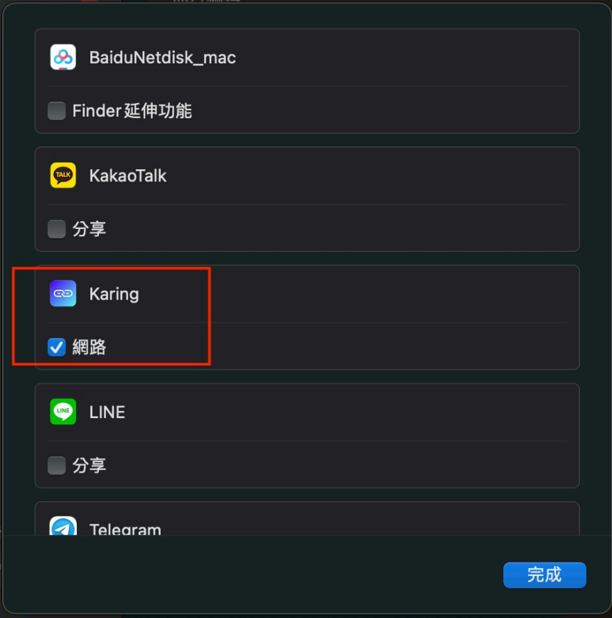 由於 Apple macOS 系統的安全性設定,Karing 需要額外授權才能正常使用。請依照以下步驟完成設定: